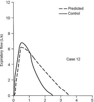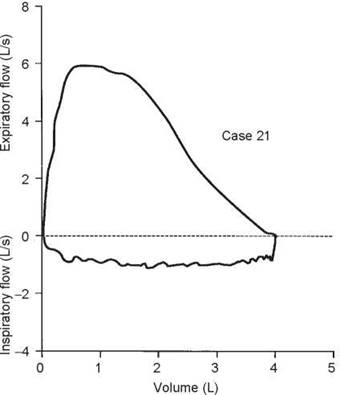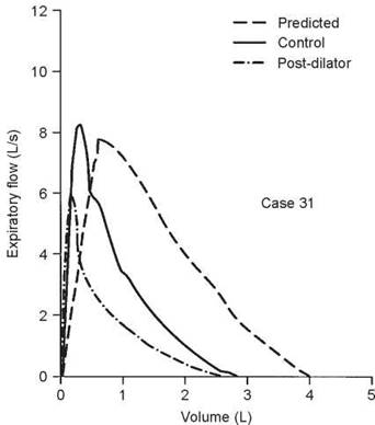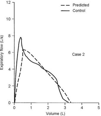 3. Over most of the vital capacity, flow decreases in a relatively gradual, steady fashion. However, at 2.4 L of expired volume, there is a ''knee'' in the curve after which flow decreases rapidly. This contour is not due to a major airway lesion but is a normal variant that is often found in nonsmokers, especially women. This patient had never smoked. This curve shape is due to the point of critical narrowing staying in the trachea until the ''knee'' is reached (see Fig. 2-6H, page 16). This is called a tracheal plateau.