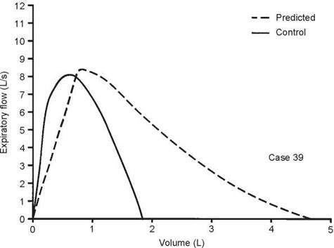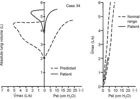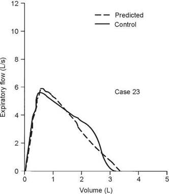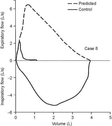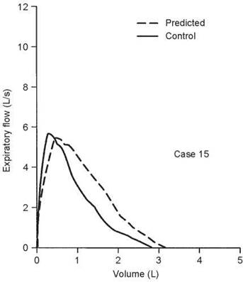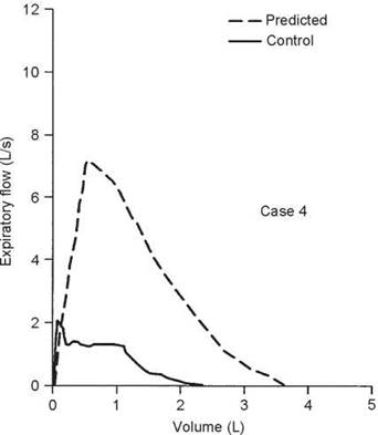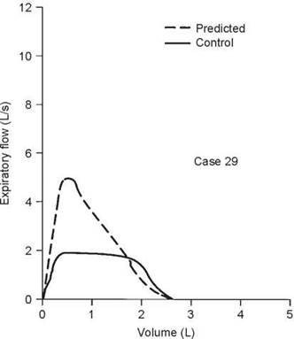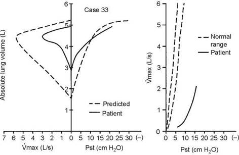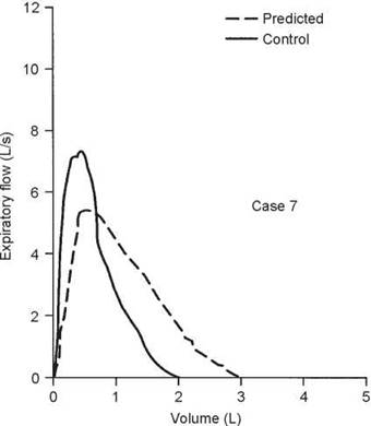 5. The test that should be ordered is an inspiratory flow- volume loop. The expiratory curve and the corresponding inspiratory loop are reproduced in the figure below as the solid lines. The nearly equal reduction in maximal expiratory and inspiratory flows points to a relatively fixed airway lesion.