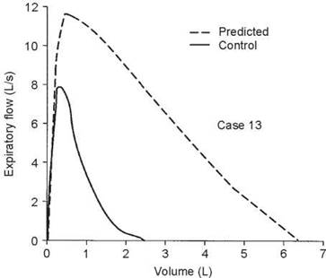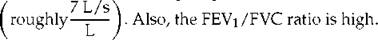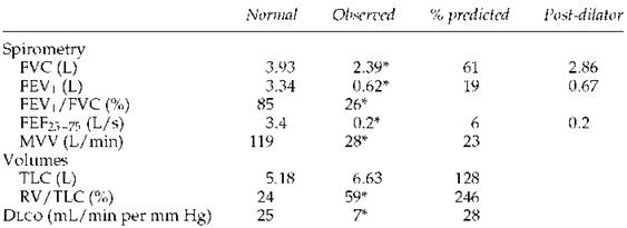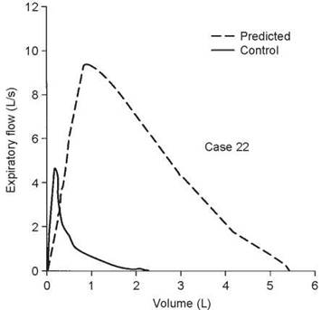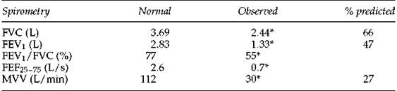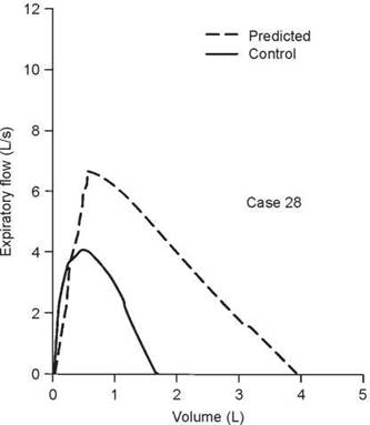 2. If only the results of spirometry were available, it could be said that ''there is severe ventilatory limitation on an obstructive basis, but a small restrictive component cannot be ruled out without a measurement of total lung capacity.'' Of course, if a chest radiograph showed hyperinflation, then it is almost certain that the abnormalities were all obstructive.