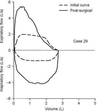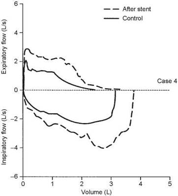 With the patient under general anesthesia, the left main stem bronchus and bronchus intermedius were dilated, and stents were placed in both. The right main stem bronchus was also dilated. The dashed flow-volume loop in the figure above was obtained 1 month after this procedure, and although the flows are not normal, they are much improved.