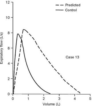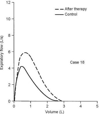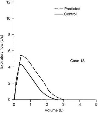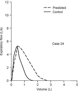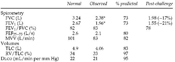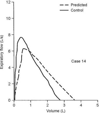The observed values are all within normal limits. However, the slope of the flow-volume curve is reduced to 1.44 L/s per liter, whereas it should be 2.0 or more (see section 2F, page 12). Because of this finding and a history of episodes of bronchitis with mild dyspnea, a methacholine challenge was performed. There was a 22% decrease in the FEV1 after only three breaths of methacholine (see section 5F, page 57). A reduced slope of the flow-volume curve may mean airway disease, in this case asthma (see case 16, page 190). However, occasionally a reduced slope is found in normal subjects who are thin and taller than 6 feet.
