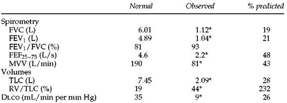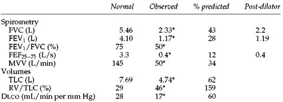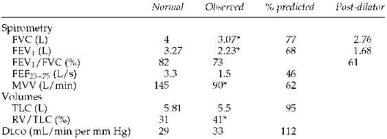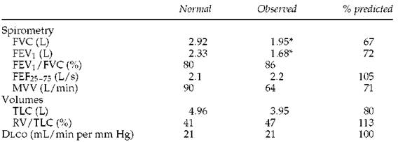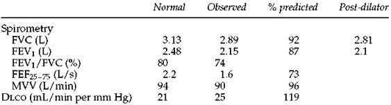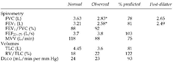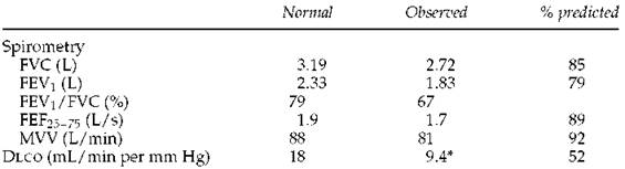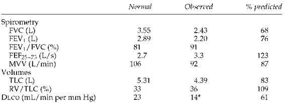 3. In this case with the hyperinflation and obstruction, the low Dlco is consistent with anatomic emphysema, and high-resolution computed tomography would be expected to confirm this. In case 10 (page 173), in which the TLC is very low and the slope of the flow-volume curve is steep, the low Dlco probably reflects the presence of some type of fibrosis. Often when the Dlco is low, however, only a general statement can be made, such as ''the low Dlcosuggests the presence of a parenchymal or vascular abnormality.''