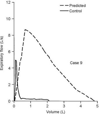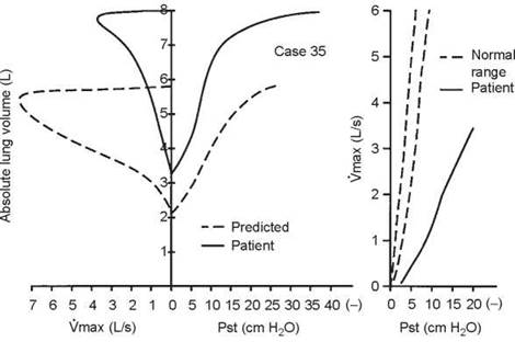 2. A test for α1-antitrypsin deficiency revealed she was homozygous for the Z gene. Special mechanics studies were ordered. Note the severe loss of lung recoil and hyperinflation. The MFSR curve lies in the normal range, consistent with the condition being pure emphysema. CLstat was increased (0.389 L/cm H2O), whereas CLdyn was low (0.132 L/cm H2O) (see section 7B, page 79). Resistance was increased at 6.2 cm H2O/L per second.