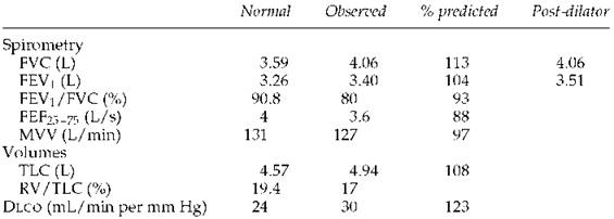 1. The test results are consistent with severe airway obstruction with hyperinflation, yet dyspnea was not a major complaint. The chest radiograph and the low diffusing capacity suggest the presence of emphysema.