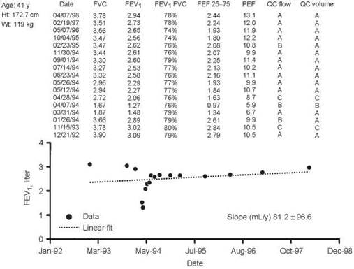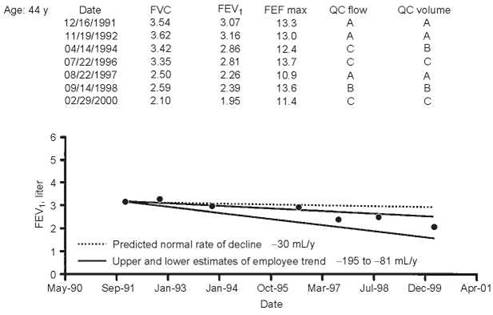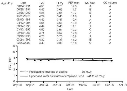 Annual monitoring of change in lung function can identify persons with accelerated decline due to smoking, occupational exposures, or other causes. This person has normal lung function, which is stable over 9 years of employment. The estimated rate of decline in FEV1 is -17 mL/y, which is normal.