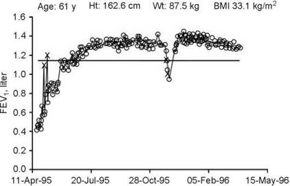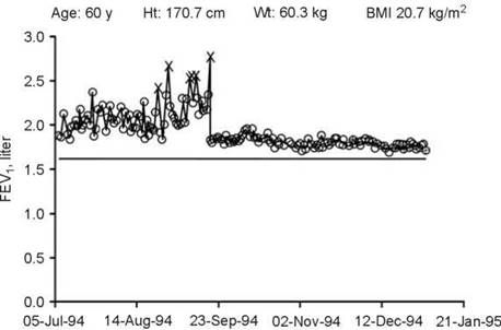 This trend is highly variable with frequent ''spikes'' showing artifactual increases in FEV1. These were due to the patient's use of a wet spirometer flow sensor. The moisture increases the flow resistance of the element, giving an increase in driving pressure and causing an overestimate of his FEV1. Values indicated by an ''X'' were deleted from analysis because they were outliers caused by a wet flow element. After the patient was reinstructed in proper care of the spirometer, the artifact was eliminated.