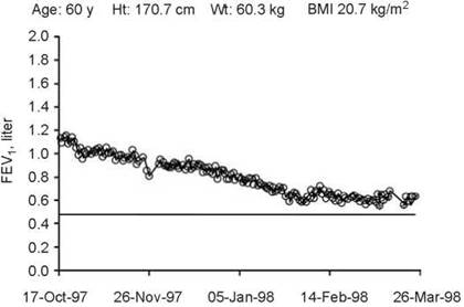 This trend shows the progressive decline in function of a patient with obliterative bronchiolitis after lung transplantation.